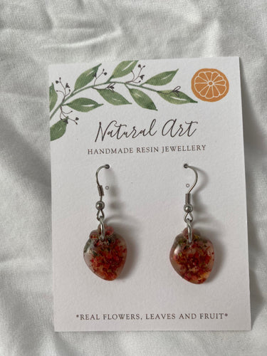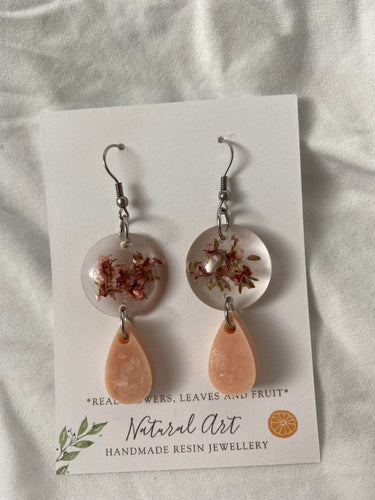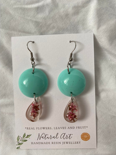 Shop resin jewellery for unique earrings and pendant sets. All pieces are made using clear resin, some coloured with resin dye and powdered pigments. Various real dried flowers are used and preserved in the clear resin.