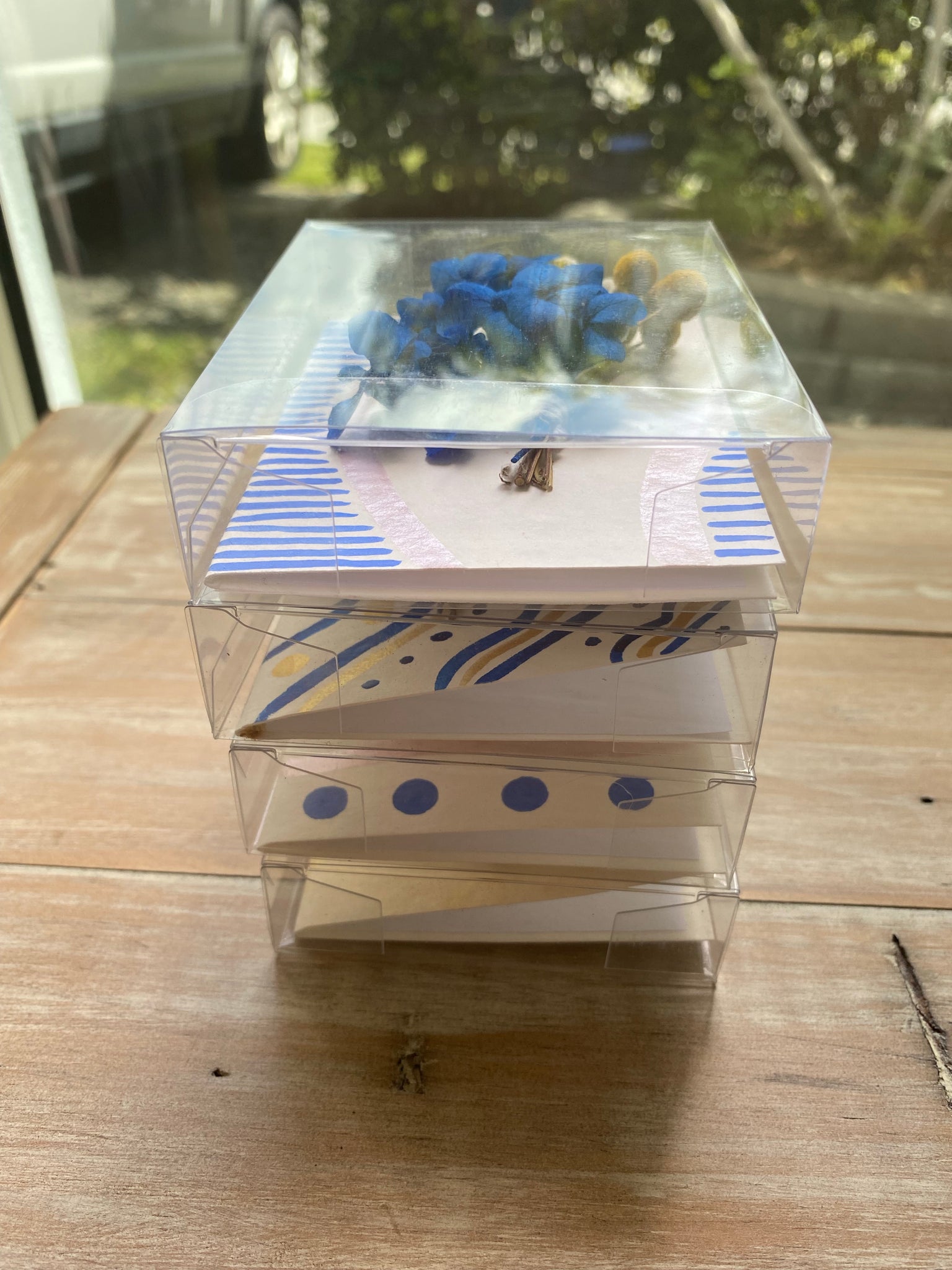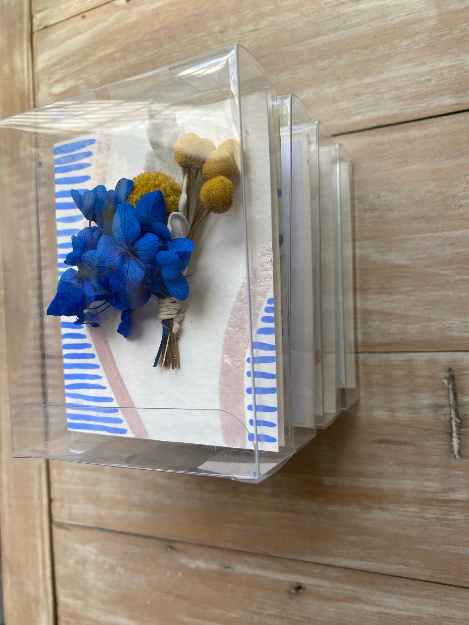 Mixed selection of mini floral cards. Each has a unique mini bouquet arrangement of dried flowers on top of a hand painted watercolour design to match. Each card is protected in a clear plastic storage box.